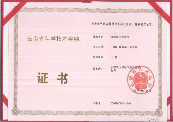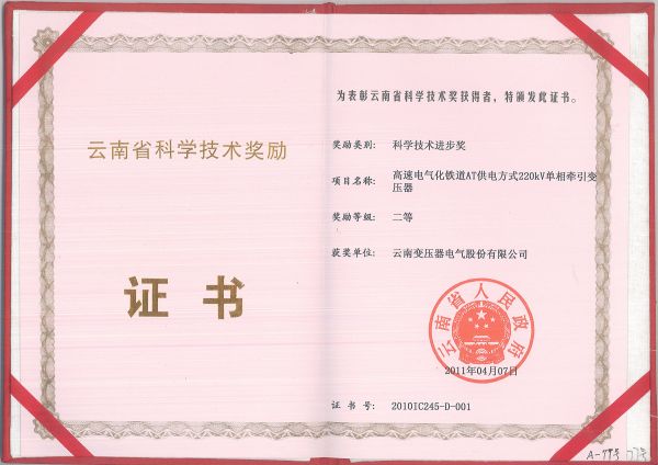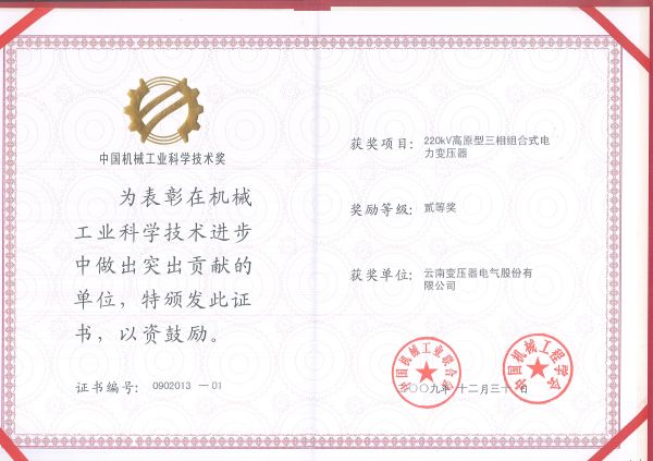 The Third Prize of Science and Technology Progress of Yunnan Province in 2009 -110kV Plateau Type Low Loss Power Transformer