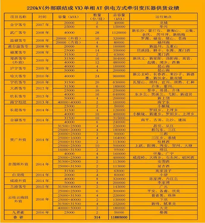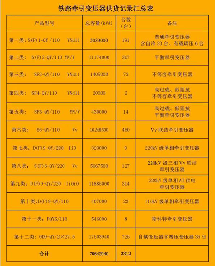 公司共生产牵引变压器三千多台,运行于中国电气化铁路各大主要干线,包括:京雄、京张、沪昆、武广、郑西、沿海高速、哈大、宁杭、湘桂、大西、杭长、贵广等高速铁路
